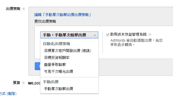 Gooogle Adwords多媒廣告聯播網的出價策略有下列幾種(下圖):