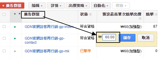 當然使用「手動單次點擊出價出價策略」搭配「啟用成本效益管理系統」時,尚須至廣告群組中先替每個群組設定每次廣告點擊費用的上限,如下圖: