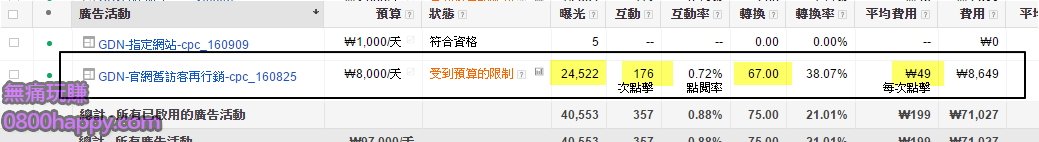 跑了一日下來的曝光、點擊、費用、轉換情形如下圖: